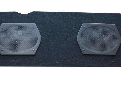 Rear panel speaker assembly for T-birds years 1955-1957. Covered with black carpet with two 6” x 9” CAM 200 watt speakers installed. Wiring harness included.